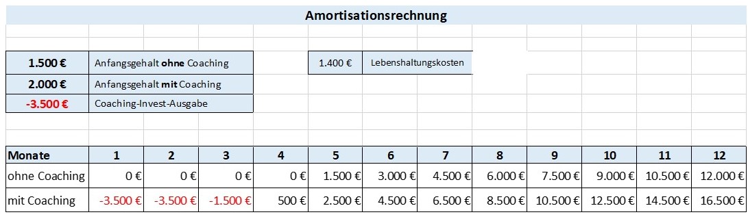 Aus dieser Tabelle wird ersichtlich, dass sich für dieses einfache Beispiel ein KarriereCoaching bereits nach 4 Monaten amortisiert hat.